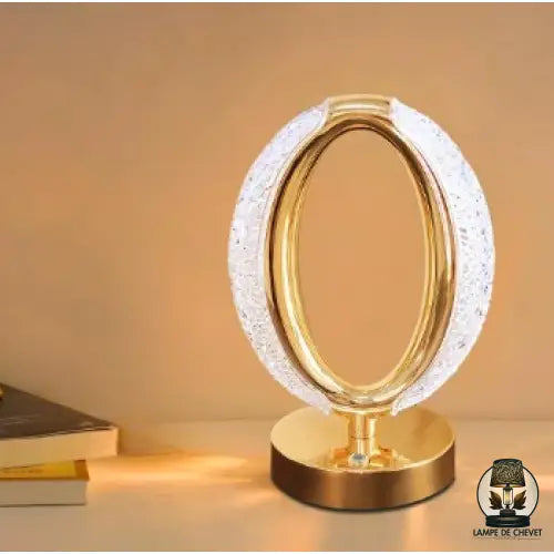 Le cadre en mĂ©tal dorĂ© et lâabat-jour en acrylique texturĂ© rappellent le cristal.