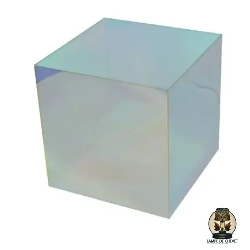 - Design géométrique et futuriste : cube en acrylique transparent aux reflets multicolores