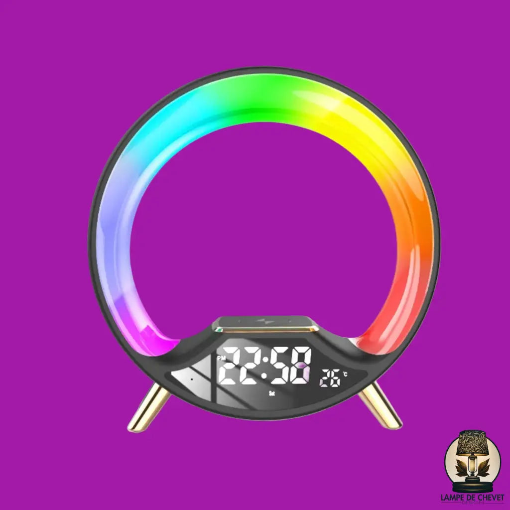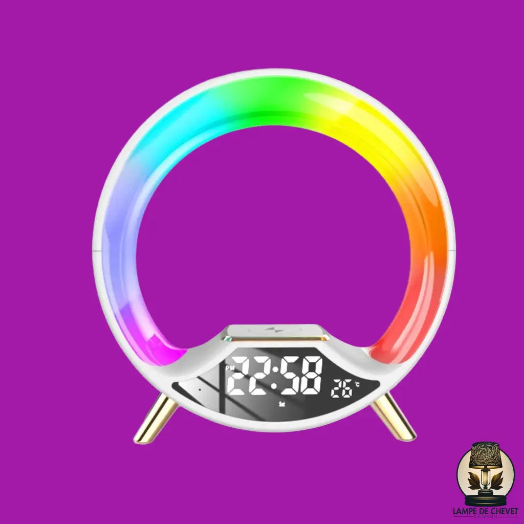 Radio réveil lampe de chevet – simulateur d’aube, enceinte bluetooth et station de charge sans fil 3 en 1.